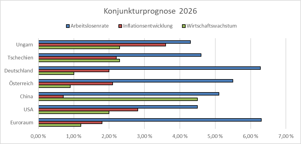 Die schwächelnde Industrie in Zentraleuropa wird das Wirtschaftswachstum wohl auch 2026 weiterhin einschränken. Trumps Zölle haben in den letzten Monaten großen Schaden angerichtet und eine Erholung dürfte noch einige Zeit in Anspruch nehmen. Der massive Stellenabbau in der deutschen Automobilindustrie bereitet auch den Zulieferern aus Österreich, Ungarn und Tschechien große Sorgen. Globale Krisen wie der Krieg zwischen Russland und der Ukraine sowie die hohe Staatsverschuldung in Frankreich, welches nach Deutschland als zweitgrößte Volkswirtschaft Europas gilt, sollten weiterhin im Auge behalten werden.