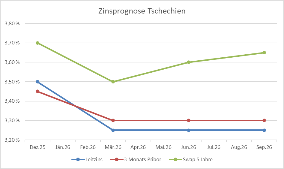 Aufgrund der hartnäckigen Inflation, der Zollrisiken und globalen Konflikte wird die tschechische Zentralbank wie die EZB eine ähnlich vorsichtige und datenbasierte Vorgehensweise in puncto Zinssenkungen wählen und dabei die Währung im Auge behalten. Sowohl das Tempo als auch das Ausmaß künftiger Senkungsschritte (Leitzins seit Mai bei 3,50 %) wird verhalten ausfallen.