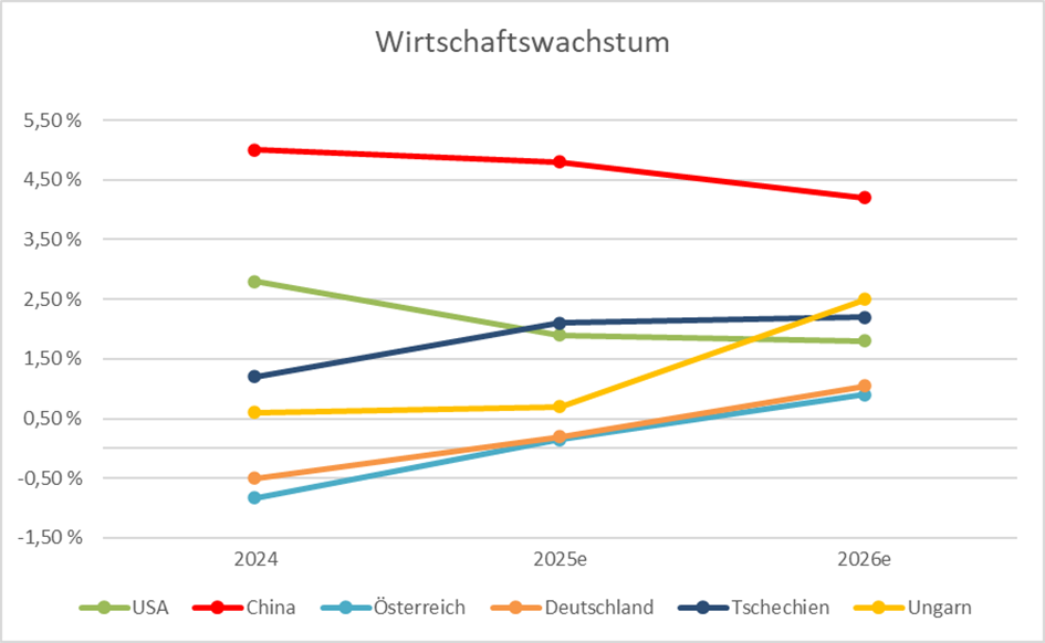 Ungarn verzeichnet im Vergleich zum zweiten Quartal des Vorjahres mit 0,30 % ein eher durchwachsenes BIP-Wachstum. Die Gründe liegen u. a. in der heimischen Produktion, die aufgrund einer schwächelnden Auslandsnachfrage (in erster Linie Deutschland) massiv zurückgefahren werden musste. Ein weltweiter Rückgang der Teuerung und des Zinsniveaus dürfte den Ungarn zugutekommen. Hier dürften Exporte durch eine Erholung der globalen Nachfrage und ansteigender Auslandsinvestitionen zunehmen. Bekannte deutsche Automobilhersteller betreiben Produktionswerke in Ungarn. Somit wird bis eine Einigung bei der Zollproblematik in Sichtweite ist, auch die ungarische Automobilindustrie unter den Handelsbeschränkungen leiden. Aufgrund der hohen Teuerung wird auch der private Konsum in den nächsten Monaten verhalten ausfallen und somit das Wachstum zusätzlich bremsen.