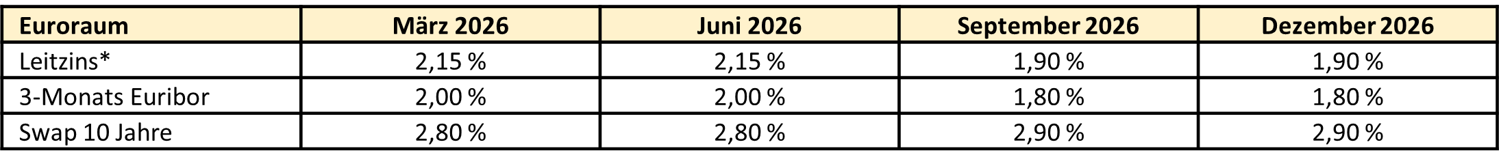 Für 2026 wird im Euroraum eine verhalten positive wirtschaftliche Entwicklung erwartet. Nach schwachem Wachstum in den Vorjahren dürfte sich die Konjunktur moderat erholen, getragen von einer stabileren Binnennachfrage, steigenden Reallöhnen und allmählich wieder anziehenden Investitionen. Das Wirtschaftswachstum dürfte sich im Bereich von 1,2 % einpendeln.