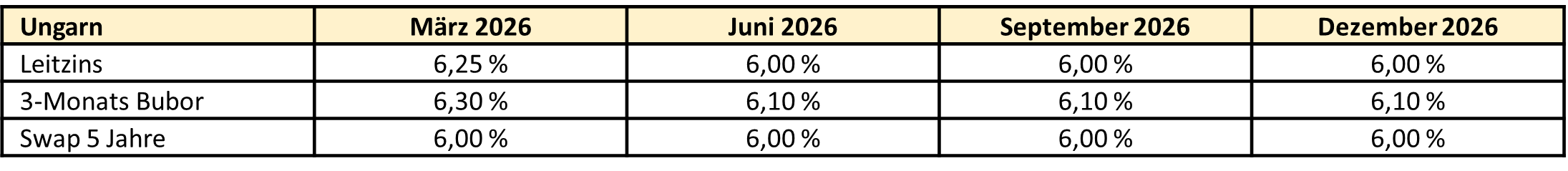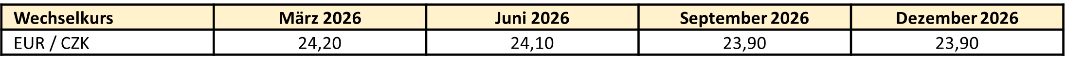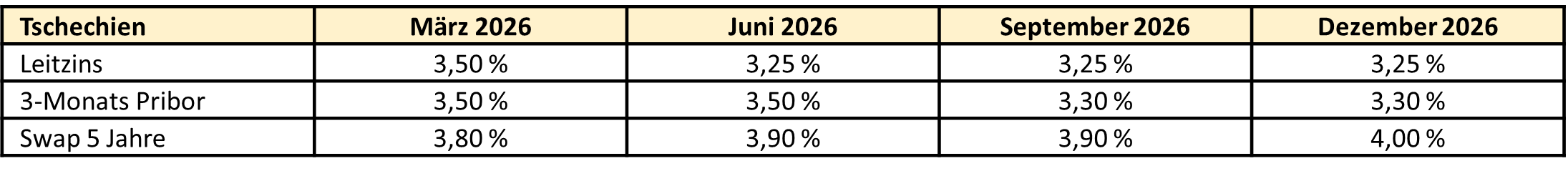 Die Inflation bewegt sich im Großen und Ganzen zwar auf einem niedrigen und stabilen Niveau – ein erhöhter Preisdruck nach Erholungsphasen sollte die tschechische Nationalbank dennoch weiterhin in ihrer restriktiven Geldpolitik bestätigen. Der Leitzins liegt seit Mai 2025 unverändert bei 3,50 %. Wir erwarten ähnliche Tendenzen und gehen für 2026 lediglich von einer Zinssenkung, die bis Mitte des Jahres auf uns zukommen dürfte, aus.
